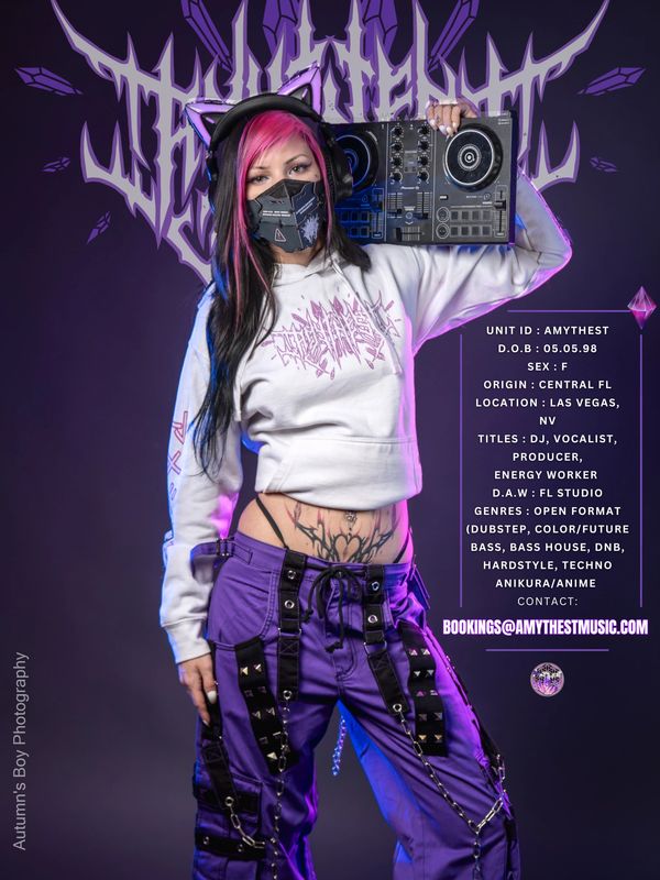 Amythest is a DJ, producer and vocalist hailing from central Florida. Currently based in Las Vegas, Nevada and voted the 'Best Dubstep Artist for 2023' through Ravehouse Entertainment's EDM awards, she is driven by her passion for impacting those around with the energy of her sound.